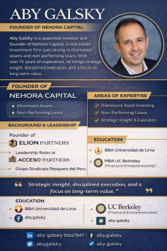 Aby Galsky is a seasoned investor and founder of Nehora Capital, a real estate investment firm specializing in distressed assets and non-performing loans. With over 15 years of experience, he brings strategic insight, disciplined execution, and a focus on long-term value. Formerly the founder of Elion Partners, Aby also held leadership roles at Acceso Partners and Grupo Sindicato Pesquero del Peru. He holds a BBA from Universidad de Lima and an MBA from UC Berkeley, emphasizing finance and entrepreneurship.