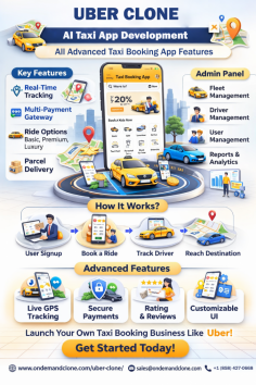 Launch a taxi business with an AI-powered Uber clone app featuring smart dispatch, real-time tracking, automated pricing, and scalable ride-hailing technology.