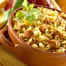 HAPPY CINCO DE MAYO RECIPES ... Tropical Pork Paella Recipe ~ INGREDIENTS: Boneless pork - Knorr® Sazon with Coriander and Annatto - 0live oil - Medium onion - Cloves garlic - Medium grain regular or converted rice - Dried pineapple - Knorr® Tomato Bouillon with Chicken flavor Cubes - Tomato sauce