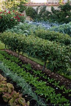 formal walled vegetable garden with cabbage, cardoon and espalier pear, august rofford manor, oxfordshire