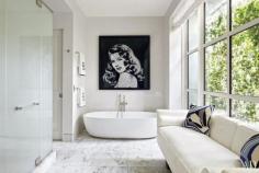 MASTER BATH A Vik Muniz work depicting Rita Hayworth hangs in the master bath; the pillows are made of Emilio Pucci silk scarves, the Boffi bathtub has Waterworks fittings, and the marble floor is by Exquisite Surfaces.