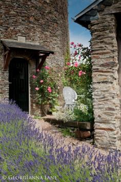 Lavender and roses at Le Pigeonnier, a restored dovecot at Le Manoir de Herouville, Calvados, Normandy, France