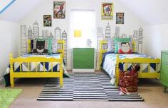 Superhero Room with hand-painted city skyline and yellow beds!