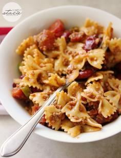 Chili Pasta Salad- tender bowtie noodles mixed with a spicy chili and tangy garlic dressing make a delicious pasta salad!