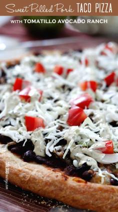 I never need to go out for pizza again! Chipotle Sweet Pulled Pork smothered in toasted Jack cheese ontop of Mexican spiced tomato black beans topped with lettuce, tomatoes and creamy Tomatillo Avocado Ranch.