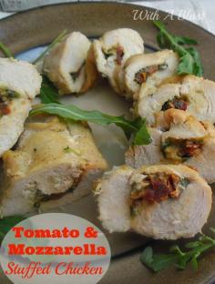 Tomato and Mozzarella Stuffed Chicken ~ Delicious stuffed Chicken, serve warm or cold - whole or sliced into wheels as mains, snacks or an appetizer #Chicken #StuffedChicken #Snacks www.WithABlast.net