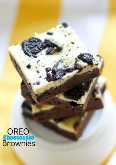These Oreo Cheesecake Brownies are a chocolate lover's dream! Fudgy homemade brownies are topped with creamy cheesecake and full of cookie pieces.