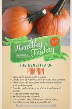 Benefits of Pumpkin.....Loaded with health benefits and super delicious, pumpkin is the perfect in-season ingredient.