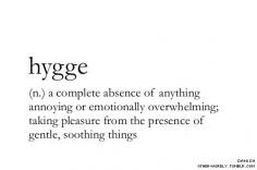 hygge (n.; Danish): the coziness you feel from being around friends, family and great food in a warm environment; all the aspects of coziness rolled into one.