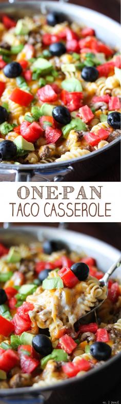 One-Pan Taco Casserole - ground beef, pasta, tomatoes and melty cheese!
