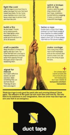 Gotta have duct tape! But what for? Here are some great ideas how to use duct tape outdoors. Backpacker Magazine - Survival A to Z: Duct Tape - Adventure Time - Adventure Ideaz