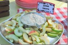 Farm birthday party food -- "horse treats," apples and dip