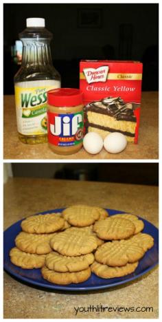 1 box yellow cake mix, 2 eggs, half cup of oil and a cup of peanut butter. Bake for 10 minutes at 350 for the easiest, most delicious peanut butter cookies ever!
