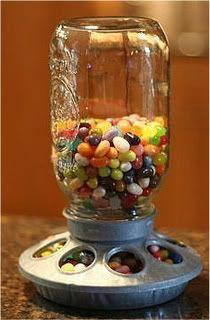 Little "Chicken" feeder...buy a cheap chicken feeder at a feed store...fill Mason Jar with candy and attach to feeder base---just perfect for a "Grandchild Spoiling Project"!!