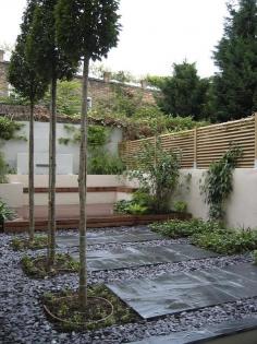 A garden in London by Modular Garden found on remodelista.com Slate pavers and crushed stone accent this simple and inviting garden well. The built in bench seating in the rear of the garden creates an perfect place to relax outdoors.