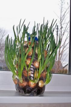 Indoor Gardening Projects • Ideas and Tutorials! Including this project, from 'auntie dogmas garden spot', see how to make this vertical onion planter from a pop bottle.