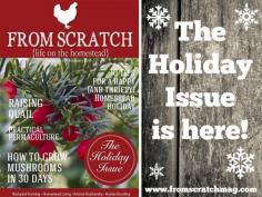The Holiday Issue of From Scratch Magazine has arrived! Check out how to have a fun and thrifty holiday on the homestead as well as lots of winter gardening tips, how to grow mushrooms in 30 days and raising quail.