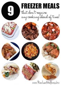 Nine freezer meals that don't require any cooking ahead of time. This sounds so easy, and I love that it includes a grocery list and recipes that you can print.
