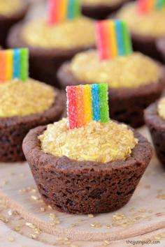 These Pot of Gold Cookie Cups have Rolos stuffed inside and a rainbow on top! Try this recipe for St. Patrick's Day.