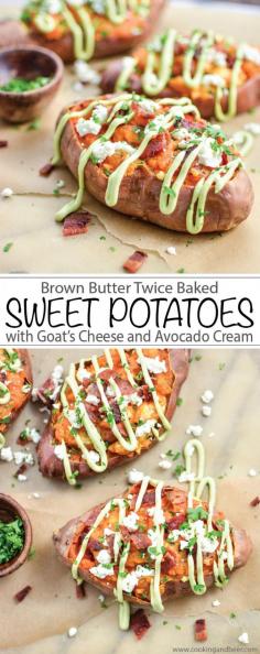 Brown Butter Twice Baked Sweet Potatoes with Goat's Cheese and Avocado Cream recipe is perfect Easter brunch or dinner! | www.cookingandbee...