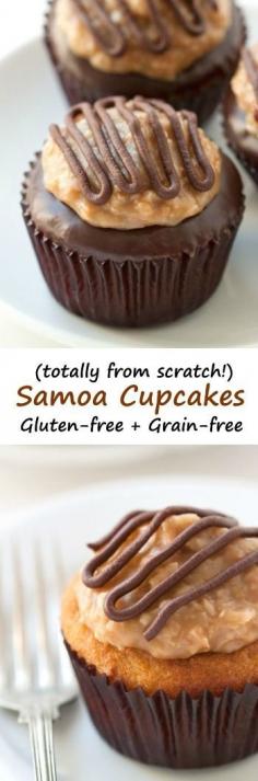 These grain-free Samoa cupcakes feature a coconut flour and brown sugar based cupcake and homemade coconut caramel topping!