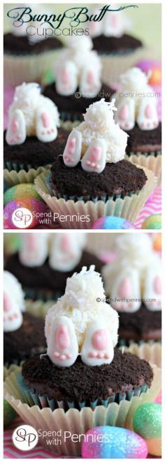 Cute little bunny tooshies top your favorite chocolate cupcakes! These are easy to put together and the perfect Easter Cupcake for any get together!