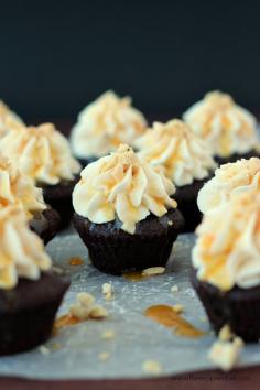Snickers Brownie Bites: mini brownies topped with peanut butter frosting, caramel and salted peanuts -- an epic combination! Freezer-friendly www.thereciperebe...