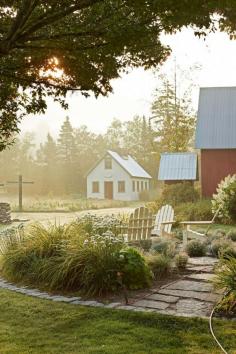 Lobelia, daylilies, nasturtium, and garlic chives surround L.L. Bean Adirondack chairs on the patio, located between the house and the main red barn. Tarr constructed the white field barn to store his tools. - CountryLiving.com