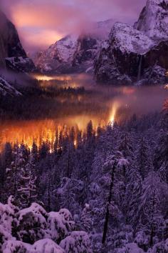 “Yosemite Valley at Night - The mist on the valley floor reflects car lights driving through ~