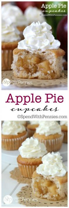 Apple Pie Cupcakes!! Our favorite cupcakes ever! Soft fluffy cinnamon cupcakes with a surprise apple pie filling in the center! These are SO easy to make!)