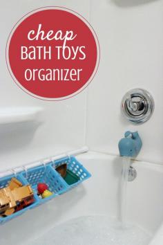 Are you looking for a way to organize all those bath toys? Well, look no further! All you need is a shower curtain rod, a few plastic bins and shower rings. Within five minutes you have the best way to organize the bath toys so that your kids can find what they want to play with - and clean it up when they're done.