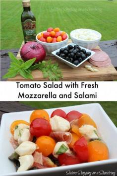 Here's the perfect way to use all your tomatoes this summer! Try this tomato salad with fresh mozzarella and salami! Yum!