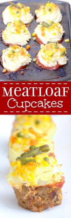 Savory meatloaf cupcakes recipe made with the BEST meatloaf recipe and topped with ketchup, mashed potato "frosting" and cheese and veggie "sprinkles." A delicious single serving family dinner recipe idea. This would be a good idea for an appetizer recipe for a party too. You could bake them in mini muffin trays!