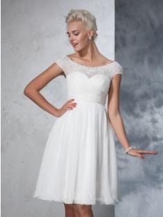 A-Line/Princess Short Sleeves Sheer Neck Chiffon Knee-Length Ruched Bridal Wedding Dresses