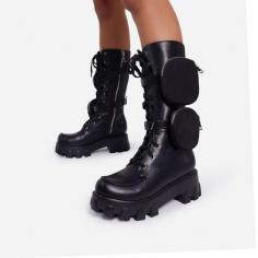 Fyre Pocket Detail Lace Up Chunky Sole Ankle Biker Boot In Black Faux Leather