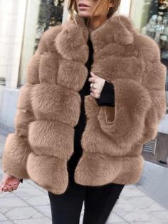 Khaki Long Sleeve Bubble Fox Faux Fur Fluffy Thick Coat Outerwear