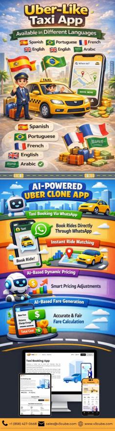 Launch an Uber-like taxi app available in multiple languages. Expand globally with multilingual support, real-time tracking, secure payments, and scalable features.