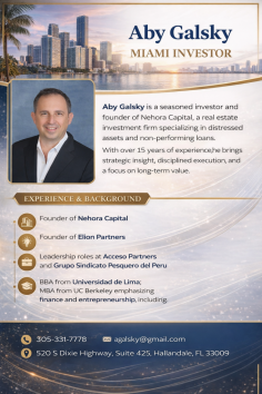A professional infographic showcasing Aby Galsky as a Miami-based investor, highlighting his experience, leadership background, and expertise in real estate investments, along with clear contact details in a clean and elegant design.