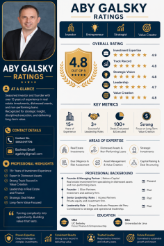 Aby Galsky Ratings infographic highlights his strong reputation as a seasoned real estate investor and entrepreneur. With over 15 years of experience, it showcases his expertise in distressed assets, strategic investments, and value creation, along with key performance metrics and high professional ratings.
